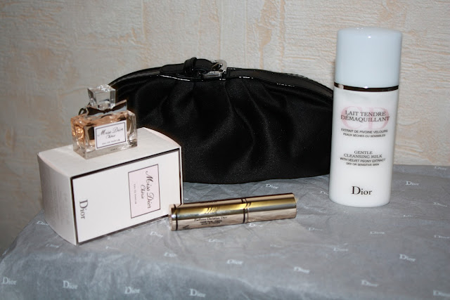 На остановке я расковыряла полиэтилен, открыла косметичку и из вороха обёрточной бумаги извлекла обещанную миниатюру и никак не анонсированные, но весьма порадовавшие меня тушь Dior и молочко-демакиянт 50 мл. Всё это сопровождалось восторженным вытаращиванием глаз, неконтролируемым аханьем, замиранием дыхания и пусканием слюней. Дома я ещё раз порадовалась и поставила косметичку со всем содержимым на полку с бьюти-припасами.